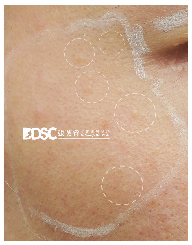 圖為白色(膚色)老人斑 (膚色脂漏性角化症),客人原本以為是皮脂腺增生與小肉芽凸起