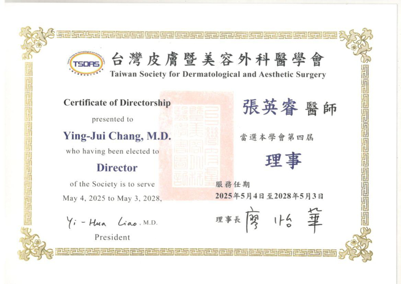 張英睿皮膚專科診所院長 亞東紀念醫院皮膚科、馬偕紀念醫院皮膚科兼任主治醫師 臺灣海峽兩岸皮膚醫學暨醫學美容交流學會理事長 臺灣皮膚科醫學會專科醫師暨美容醫學皮膚科醫師 臺灣皮膚科醫學會理事暨兩岸事務委員會主任委員 衛生福利部皮膚科專科訓練醫院評鑑委員 中華民國醫用及光電學會理事 臺灣研究皮膚科醫學會會員 教育部部定助理教授 中華皮膚科醫學雜誌 (Dermatologica Sinica) (SCIE) 編輯委員 臨床皮膚科雜誌(江蘇) (Journal of Clinical Dermatology) 編輯委員 徐州京城皮膚病醫院名譽院長 亞洲皮膚科醫學會院士(AADV, ASD) 美國皮膚科醫學會(AAD)會員 國際皮膚科學會(ISD)會員 國際皮膚鏡學會(ISD)會員